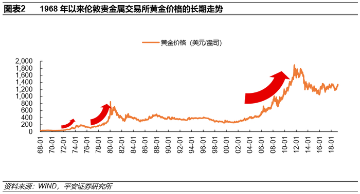 从长期趋势来看,近半个世纪以来,黄金价格共经历了三次大规模的上涨。第一次发生在1971-1974年期间,金价从39.6美元/盎司涨至179.5美元/盎司,涨幅达354%;第二次发生在1976-1980年期间,金价从103.5美元/盎司涨至850.0美元/盎司,涨幅为721%;第三次则发生在2001-2011年期间,金价从256.0美元/盎司涨至1895.0美元/盎司,上涨640%。从更长周期看,在1933年之前,金价一直维持在20美元/盎司左右,振幅很窄;1934-1967年,自富兰克林·罗斯福总统将金价固定后,金价一直维持在35美元/盎司的水平;1967年后,黄金市场放开,金价开始波动上涨,并在20世纪70年代上半叶、下半叶与21世纪最初十年分别经历了三轮长牛。