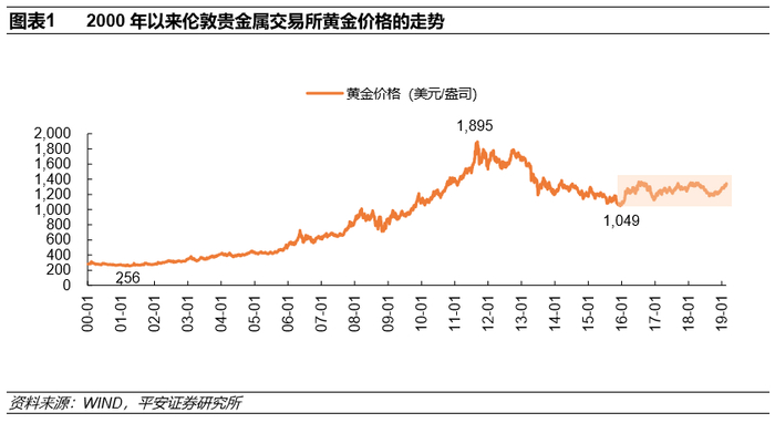 自2001-2011年的十年间,全球黄金价格由起初的256美元/盎司的低位显著上涨至1895美元/盎司的历史最高点,整体上行达6.3倍;但从2011-2015年的五年间,全球金价则从1895美元/盎司的历史峰值回落到1049美元/盎司的阶段低位,跌幅近45%;在2016年至今的三年多时间里,国际金价则维持箱体震荡走势;近期国际金价则从2018年8月中下旬1178美元/盎司的阶段低位开始,至近期高位1350美元/盎司已反弹14.6%。