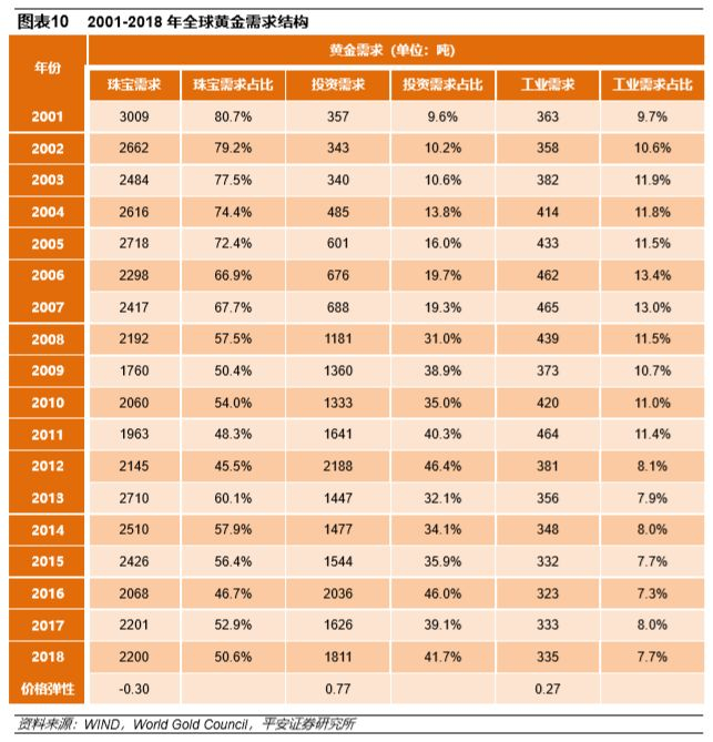 从需求角度看,黄金的珠宝需求占比虽然最高,但是比重已从2001的80.7%下降到2018年的50.6%;投资需求占比则从2001年的9.6%上升至2018年的41.7%,与珠宝需求的差距已经不大;工业需求占比从2001年的9.7%小幅震荡回落至2018年的7.7%。就目前而言,珠宝首饰的需求占了黄金总需求的一半左右,央行与私人部门的投资需求分别占15%和26%,剩下8%左右用于工业用途。另外,黄金的珠宝需求、投资需求、工业需求的价格弹性分别为-0.30、0.77和0.27,说明全球黄金的投资需求与金价的正相关程度较高,黄金投资有着较明显的“追涨杀跌”倾向。
