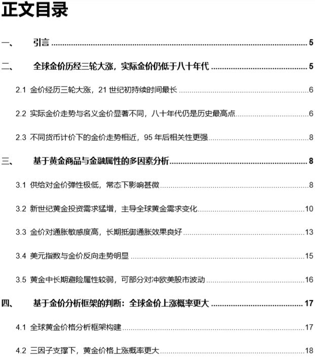 基于第三章关于黄金商品与金融双重属性的多因素分析,我们构建了黄金价格的分析框架,并利用该框架对未来金价的走势给出了判断。