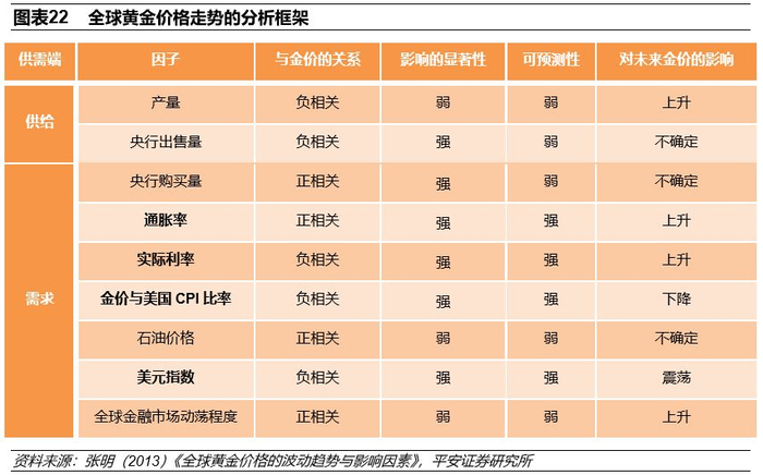 我们构建国际黄金价格的分析框架时考虑的是黄金的供给、需求、全球通胀水平、主要货币汇率与全球金融市场的动荡程度等多个影响因素。这是基于黄金的商品属性与金融属性综合得到的结果,其中,黄金的商品属性体现在供求对价格走势的影响上;而抗通胀、防货币贬值与避险则是黄金金融属性的体现,通过投资需求影响黄金价格。