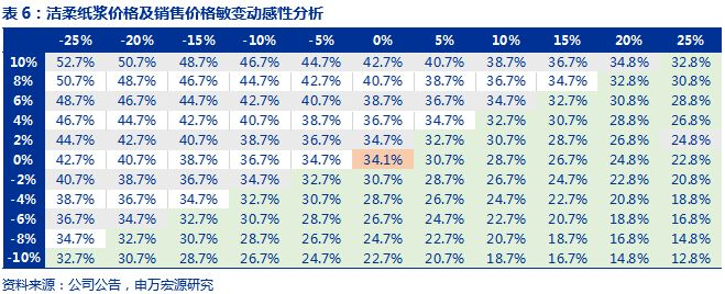 洁柔纸浆价格及销售价格敏变动感性分析:为了更好地测算纸浆价格及销售价格变动对洁柔毛利率带来的影响,我们通过敏感性分析进行测试。假设纸浆价格分别波动范围从-25%~25%、销售价格波动范围为-10~10%,根据测算公式:毛利率=(吨销售价-吨纸浆成本-其他成本)/吨销售价,洁柔在2018年毛利率34.1%的基础上,根据2019年市场情况,我们假设销售价格基本保持不变,并且公司采购浆价的折扣保持不变,2019年纸浆价格同比变动幅度为-15%~-5%之间,毛利率的变动区间为34.7%~38.7%。