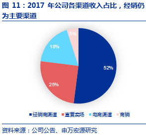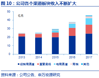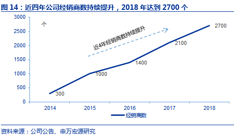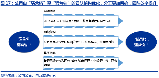 公司整体营销水平的改善源于进取的营销团队和完善的组织结构。2015年之前,公司的发展特点为“强产品,弱营销”,2015年公司全面引进新营销团队,明确了以渠道建设为中心的发展战略,建立了经销商、直营卖场、商销、电商四大销售渠道,为公司日后渠道开拓奠定良好基因。同时,公司对营销组织架构和体系进行完善,由原来五大区域细分为8+2区域(其中八大区域分别为:华南、西南、云贵广、华中、华东、华北、西北、东北, 单独成立EC及港澳区),管理层级细分为区总-省总-城市经理-业务经理,自上而下进行KPI考核,从而提升整体营销和运营效率。