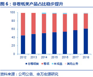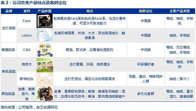 基础款产品稳健发展,同时不断研发差异化产品。公司产品在卷纸等基础品类上稳健发展,手帕纸、软抽等中高端品类不断加强品牌建设,及时满足消费升级趋势,主打品牌Face和Lotion在市场上的知名度不断提升。2018年公司非卷纸类收入规模为34.73亿元(占比61.2%),卷纸类实现收入规模20.72亿元(占比36.5%)。此外,公司将产品定位进一步细分,涉及环保纸种、酒店专供纸种、厨房用纸等,同时整合产品形象,升级产品包装,使终端陈列更时尚抢眼。