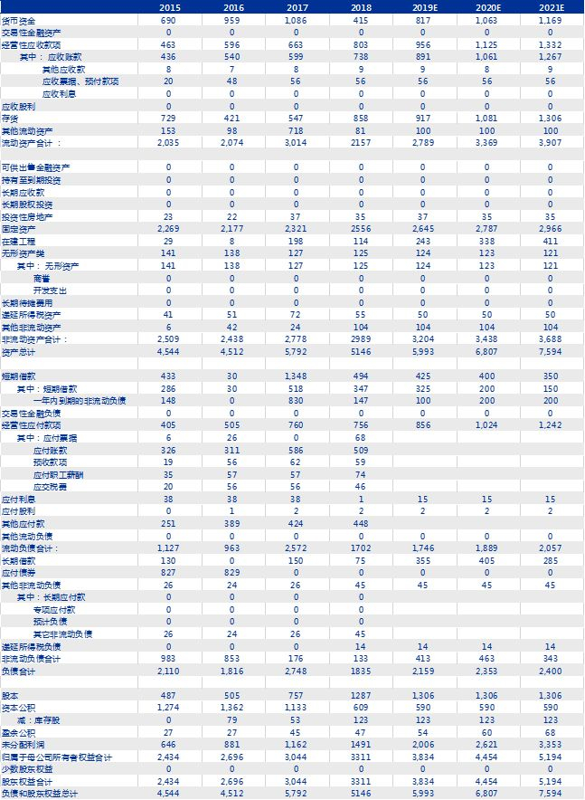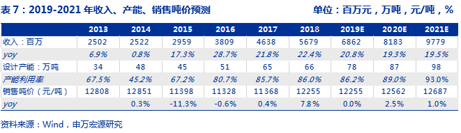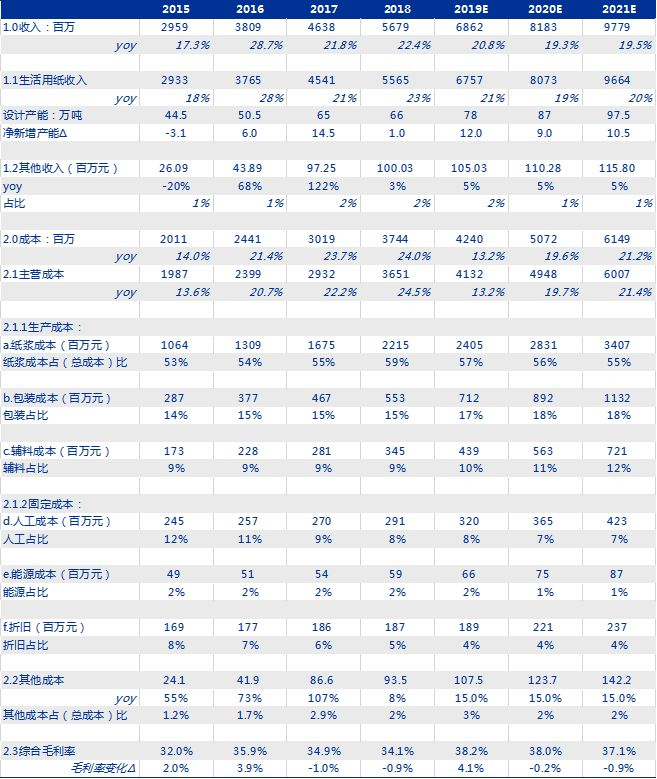 收入层面,预计公司生活用纸板块业务增长稳健,我们假设产能层面,2019-2021年新增产能分别为:12万吨、9万吨、10.5万吨,总产能分别为78万吨、87万吨、98万吨 ,销售吨价分别变化0%、2.5%、1.0%。公司2019-2021年整体实现收入68.62亿元、81.83亿元、97.79亿元,收入增速为20.8%、19.3%、19.5%。