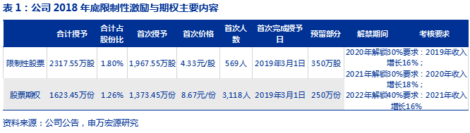 2018年末推出复合激励计划,促使公司自下而上有效发展。2018年底公司推出复合激励(股票期权+限制性激励),总计的激励授予为3941万份,其中2019年3月已完成首次授予1373万份期权及1968万股限制性股票;预留600万份(其中股票期权250万份+限制性激励350万份),占比15.2%。其中期权行权价格为每份8.67元/份,限制性激励价格为4.33元/股。