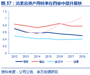 洁柔由于聚焦中高端生活用纸产品,具有较强盈利能力。四家生活用品龙头公司综合毛利率排序为恒安、洁柔、维达、金红叶,洁柔2017年综合毛利率超过维达,同时洁柔生活用纸板块毛利率2017年超越恒安(仅生活用纸板块2017年洁柔毛利率为34.9%,恒安毛利率为32.9%)。洁柔净利率在2014-2015年处于低位,随后经过洁柔对于销售管理团队的更新,洁柔净利率提升至2018年7.2%,因淘汰部分落后产能,提升总资产运营效率,总资产周转率也有明显提升,上升至1.0。公司注重产品的研发能力,在产品品质、包装样式、风格特点上更具有特色,消费者客群黏度更强,保持较高盈利水平。