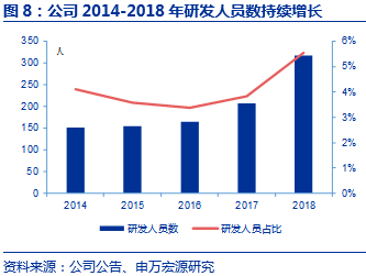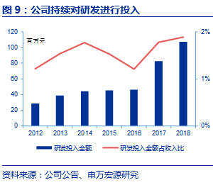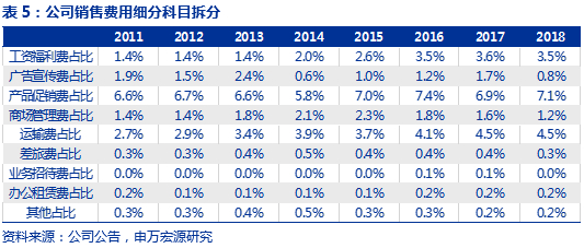 公司研发人员和研发投入均不断提升,增强整体研发实力。公司在新品研发方面不断加强,并且较为注重研发团队的建设和费用投入。公司研发人员数量从2014年152人提升至2018年318人,研发费用从2014年4451万元提升至2018年的1.08亿元。2017年研发人员和研发费用增多,主要系公司对于新品的研发力度加大,如2017年推出“自然木”系列,及为2018年“新棉初白”研发做准备。由于公司2019年预计布局新的产品领域,因此我们预计研发费用投入仍将保持2%左右的水平。