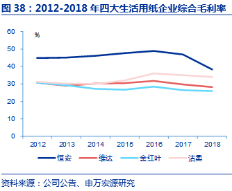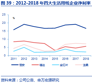 随着洁柔在美妆和个护用纸板块不断布局和创新,盈利能力提升空间较大。四大企业中恒安规模最大,2018年为205亿收入规模;剔除个护板块,恒安和维达生活用纸规模相近,2018年均超过100亿元。盈利能力方面,由于恒安高毛利的个护板块占比为32%,因此综合盈利水平处于第一。目前,个护板块如卫生巾子行业,因品牌粘性高、差异化定价,因此新品牌进入门槛高;但一旦形成较好的品牌口碑及稳定客群,就能建立较深的护城河,取得长期可持续的盈利增长,是未来洁柔有待发力的板块。