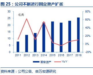 公司固定资产投资不断扩张,购入更加高效、环保的生产设备。公司固定资产绝对值不断提升,从2011年7.87亿元提升至2018年末的25.56亿元,随着业务扩张,公司不断于全国进行产能布局,购入更先进的设备资产,产能利用率由2014年45%左右提升至2018年80%以上。