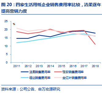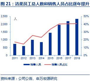 营销费用投入在同行中较高,同时注重营销团队的培养。洁柔2018年销售费用为10.13亿元,销售费用率为17.8%,在四大生活用纸公司中排第一,比恒安、维达和金红叶的销售费用率均要高,侧面印证了公司对于营销方面的投入较大。同时,公司对于销售人员的配比也在不断提升,销售人员数量从2011年742人提升至2018年2346人,人员数增长216%,销售人员占比也在不断提升,由2011年17%提升至2018年41%,主要系营销需求加大以及直营业务占比提升所致,从而体现出渠道的变革和完善。公司营销费用和销售人员配置比例的提升,使公司产品更好地推向市场,更快提升市场份额。