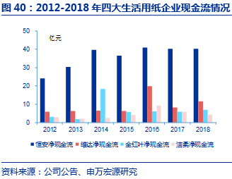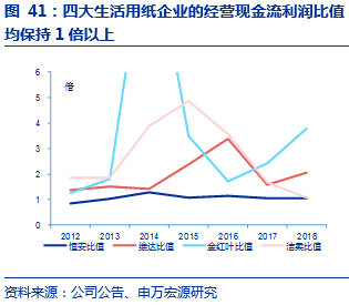 洁柔经营性现金流逐季改善,2019年预计保持稳健水平。2018年洁柔实现经营性净现金流净额为4.37亿元,同比减少25.3%,主要系存货占用的现金流比2017年同期增加1.9亿元,应收账款占用的现金流比同期增加0.6亿元。从2018年单季来看,2018Q4实现经营现金流净额4.79亿元,环比增长82.6%,经营性现金流逐季改善。随着公司前期高价浆的逐渐出清,2019年洁柔经营性现金流预计呈持续向好趋势。从经营现金流利润比值来看,前四大的2012-2018年比值均大于1,说明盈利质量较好。