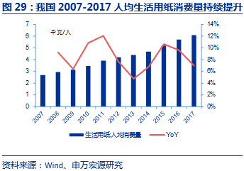 2011-2017年,全球生活用纸消费量的每年增长率均低于4%,中国生活用纸消费量的每年增长率均超过6.6%,中国仍是全球各主要区域中生活用纸增长率最高的市场。国内生活用纸市场整体来看:具有行业空间大、人均用量低、受益于消费升级趋势,因此从中长期看来,处于较好的行业发展赛道。