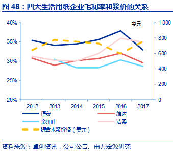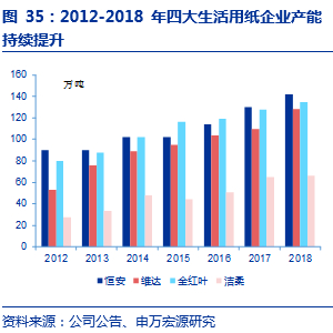 根据生活用纸行业协会,2017年我国生活用纸行业规模为1106亿元,CR4集中度为35%,未来随着中小产能淘汰退出、以及龙头企业规模提升,行业集中度有望持续升高。