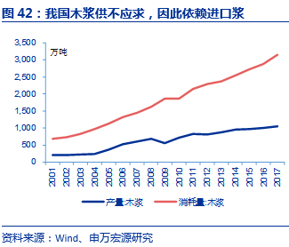 木浆为我国生活用纸主要原料,国内依赖进口浆进行补充。生活用纸通常由木浆、竹浆、蔗渣浆、草浆、废纸浆制造而成,木浆是当前生活用纸的主流原材料,占比为81.7%,一流生活用纸企业现已基本采用100%的原生木浆材料,从生产成本及产品质量来说都要高于地方性小企业。木浆供需来看,2017年我国木浆总产量1015万吨,消耗量3152万吨,供不应求的现状致使我国大约60%的浆依赖于进口补充,因此国内原材料端的成本也受国际浆价波动而变化。