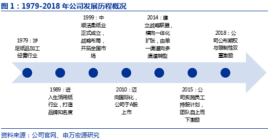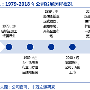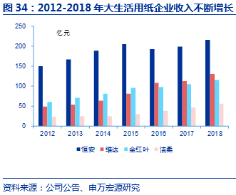 维达国际:维达成立于1985年,港股上市。公司生活用纸和个人护理产品收入占比分别为81%和19%并基本维持稳定,2018年实现总收入130.41亿元,同比增长16.4%(剔除汇率影响,同比增速为11.0%)。维达的大股东SCA是全球领先的卫生用品和林业公司,旗下拥有添宁(TENA)和多康(Tork),以及轻曲线(Libresse)、得宝(Tempo)等诸多品牌,2007年收购维达20%股份并陆续增持于2013年成为第一大股东,目前持股占比52%。2015年维达以28亿港元整合爱生雅于东南亚、台湾和南韩之卫生用品业务,进一步进行业务整合从而增强维达竞争力。
