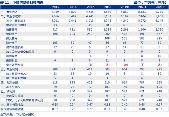 渠道持续扩张,产品结构调整升级,精细化管理挖掘盈利潜能,公司基本面持续改善。公司高管及员工在充分激励机制下, KA渠道合作拓宽、线上平台获得突破进展,渠道建设多点开花,收入稳健增长。产品结构调整,高毛利率产品占比提升,推进原有产品升级换代,差异化竞争提升客群粘性,精细化管理保证盈利能持续改善。由于我们看好公司2019年新品带来的收入提升、渠道持续下沉和改善、2019年使用较低价浆从而具备盈利弹性,我们估计若购入浆价下降10%+,假设保持销售价及费用不变(实际可能存在由于竞争所导致终端价下跌及费用率提升),毛利率具备2pct~4pct 的提升空间,对应归母净利增速yoy28%-56%。基于公司具备收入规模提升和盈利向上弹性,我们上调公司2019-2021年EPS至0.40元、0.48元、0.57元的盈利预测(原EPS为0.38元、0.46元、0.55元),对应2019-2021年增速28%、19%和19%,4月16日股价(9.87元)对应2019-2021年PE 分别为25倍、21倍和17倍,我们长期看好洁柔在行业中的成长逻辑,同时看好公司品牌价值的树立,我们给予2019年末目标价11.63元/股,具备17.8%上涨空间,对应29.1倍,维持“增持”评级!