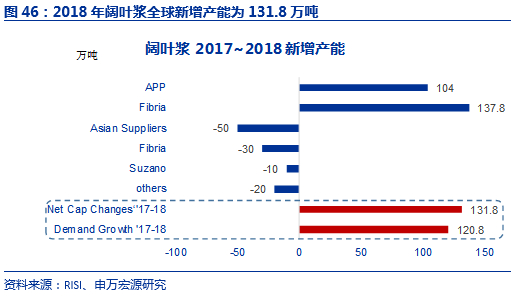 全球木浆产能以海外供给为主,18年扩增产能浆价趋稳。全球阔叶浆主要产能分布在巴西,产能占比高达46%,全球针叶浆布局于北美占到超过一半水平。木浆的供给和价格体系也以海外大厂为主导,例如2017-2018年浆价上涨系全球浆厂事故和罢工、停产检修等重要因素。但是,随着2018年新增阔叶浆产能逐渐投产,新增产能为131.8万吨,未来全球木浆的供给紧张的情况有望缓解,从2018年下半年以来我们已经看到浆价下跌的趋势。