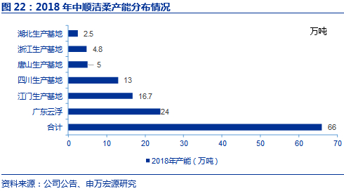 四大生活用纸企业收入规模不断增长,洁柔产能提升较快从而满足需求。从收入规模上来看,恒安收入规模约为洁柔的三倍。2018年恒安总产能为142万吨,洁柔产能方面和前三大仍有差距,2018年洁柔总产能为66万吨,随着公司唐山10万吨、湖北30万吨、云浮二期12万吨高档生活用纸项目的逐渐投放,洁柔将全面形成华东、华南、华西、华北和华中的生产布局,满足持续扩张的规模增长需求。