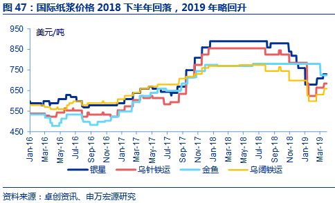 目前国际浆价平均水平为730美元/吨,较2018年高位已回落18%。2018年底纸浆期货推出,有助于平滑纸浆价格并提升采购商话语权。