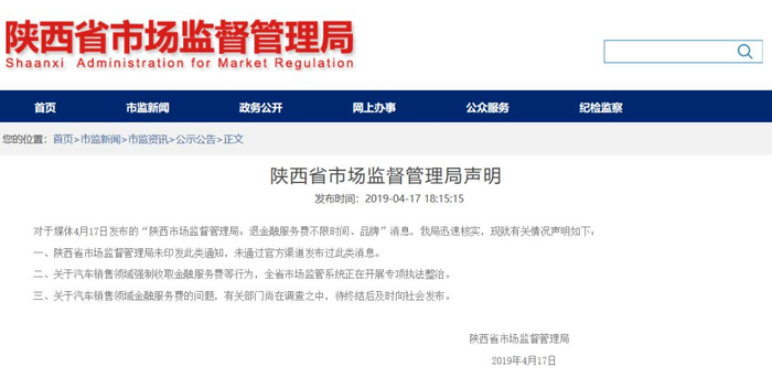 昨日,网上有消息称,陕西省市场监督管理局12315投诉热线客服人员介绍,商家收取金融服务费行为不合理,目前已收到通知,所有在陕西省境内购车被4S店收取过金融服务费的车主,都可找商家协商退费。对此,陕西省市场监管局官方发布声明回应称,陕西省市场监督管理局未印发此类通知,也未通过官方渠道发布过此类消息。关于汽车销售领域强制收取金融服务费等行为,全省市场监管系统正在开展专项执法整治。关于汽车销售领域金融服务费的问题,有关部门尚在调查之中,待终结后及时向社会发布。