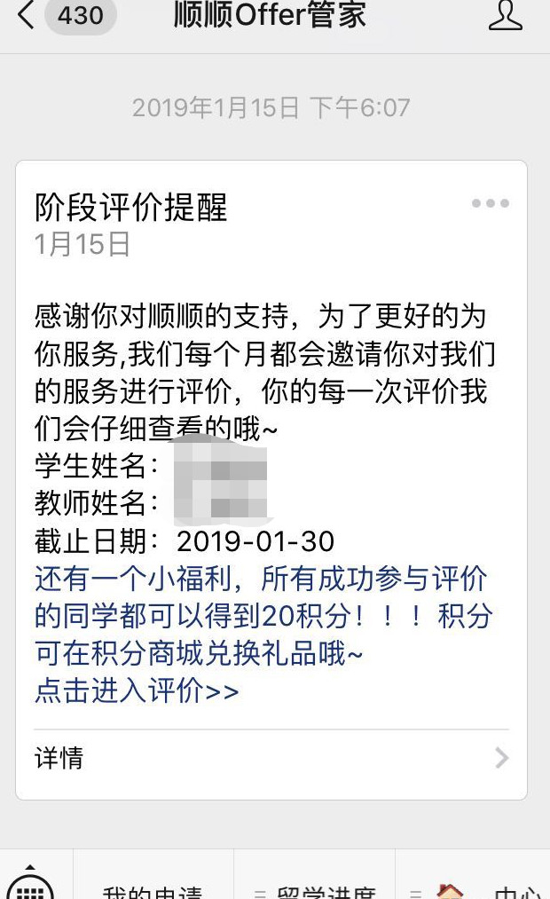 留学机构内部有一套监督顾问的机制。如果对顾问不满意,客户可直接在日常沟通的微信群中投诉顾问,津桥留学会派遣专员监管顾问服务。顺顺留学则配备了在线监督平台,要求学生每月给顾问打分,并安排专员每月通过电话回访。若接到投诉,由客服负责调解,情形严重者,由顾问上级解决矛盾。