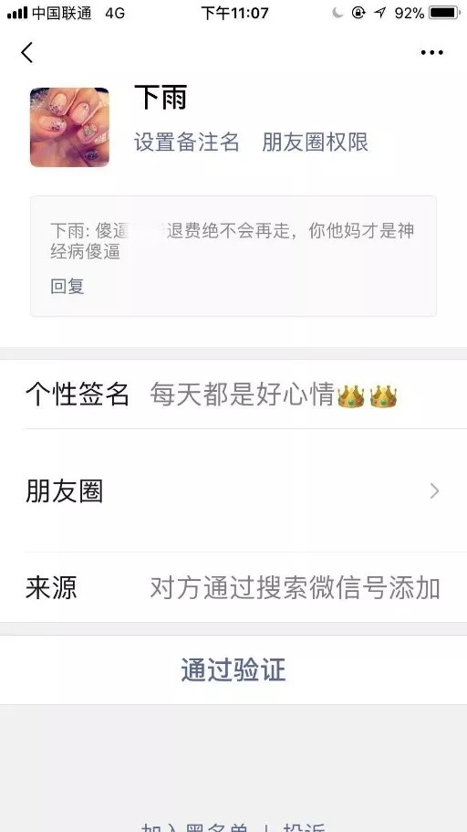 李华的退款过程并不容易,承诺的退款没有在规定日期内到账,津桥留学的说法也发生了180度大转弯,声称这不属于自己的职责范围。与此同时,顾问赵欢开始骚扰李华。短短几天内,赵欢不停给李华发短信、邮件、微信,骂李华“傻逼”“怂蛋”“神经病”。李华还接到了不同留学中介的电话,一问才知道,赵欢把她的电话发到了移民留学中介平台上。