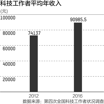 《报告》指出,过去几年,科研人员收入增加但收入满意度持续下降。2016年科技工作者平均年收入为90985.5元,比2012年增长了22.7%。但科技工作者对自身收入在当地相对地位的判断呈现持续下降趋势,33.5%的科技工作者认为自身压力主要来源于经济收入。