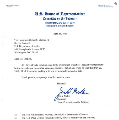 纳德勒在信中写道,“我要求你尽快向司法委员会作证,但无论如何,最迟不得晚于2019年5月23日”。