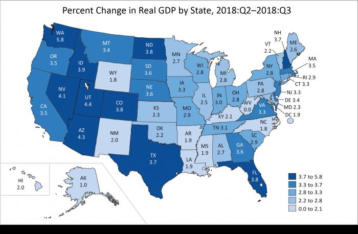 根据美国经济分析局最新的各州GDP数据,2018年第三季度,佛罗里达GDP增长3.8%,得克萨斯州增长3.7%,亚利桑那州增长4.3%,而纽约州增长2.8%,加州增长3.5%,新泽西州3.3%,伊利诺斯州为2.5%。
