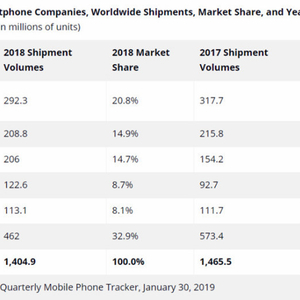 2018年,华为手机(含荣耀)全球出货量为2.06亿台。在其之上,苹果和三星的全球出货量分别是2.088亿台和2.923亿台。