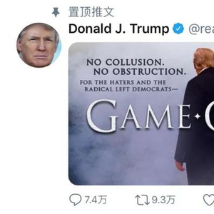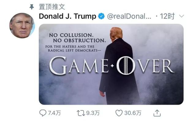 当地时间18日,长达448页的穆勒报告删减版全文对公众公开,报告没有发现特朗普竞选团队“通俄”证据。为了宣告这一阶段性的胜利,晚上22时左右,特朗普在个人推特模仿《权力的游戏》(Game of Thrones)的说法,发了一张“游戏结束(Game Over)”的照片。️