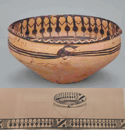 舞蹈纹彩陶盆是青海海南藏族自治州同德县宗日遗址出土,属于新石器时代的马家窑类型,距今5000多年,是黄河上游最有代表性的文化。它高12.5厘米,口径24.2厘米,腹径24厘米,底径9.9厘米。敛口,卷沿,小平底,黑彩纹饰,口沿处有成组的对顶三角纹和成组的斜线纹,外壁绘有三道平行弦纹,口沿内壁绘有两组手拉手群舞的人体图形,一组11人,一组13人,共24人,人物的头部戴有宽大的头饰,腰部以圆球形为装束,人物之间以弧线纹、斜线纹、圆点纹相隔,人物的脚下饰有四条平行弦纹。整个画面看似静止,却似乎能够感觉到那种有节奏的舞动。一件小小的彩陶体现出了远古观察生活、表现生活的能力,也让我们看到当时先民的审美能力。