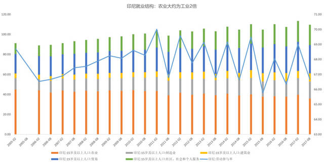 东南亚五国都出现了不同程度的农业人口减少,向制造业等其他行业转移的现象,例如印尼农业人口大约是工业的2倍,但农业呈下降趋势: