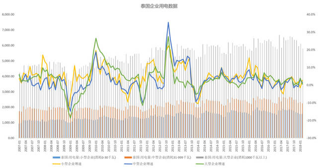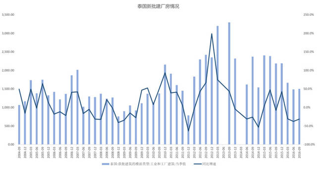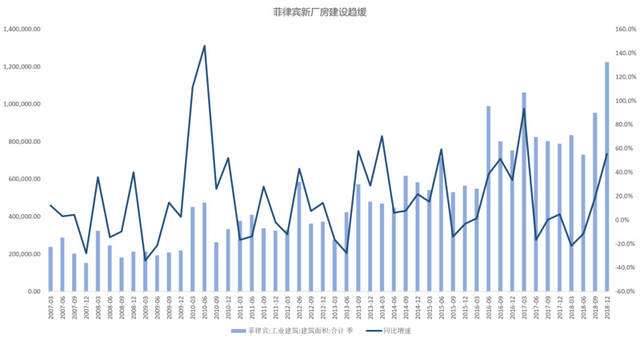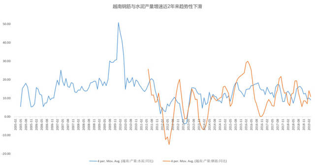 除电力数据外,厂房建设也是工业非常重要的指标。由于各国统计局数据统计不一样,在这方面选取泰国、马来西亚、菲律宾的工业厂房相关数据进行对比,越南则用“钢筋+水泥”的数据作为参考指标。数据中显示,马来西亚在 2017 年的工业厂房建设处于比较火热阶段,泰国新批工业厂房增速下滑严重,越南的水泥和钢筋产量亦增速放缓,菲律宾近2年来也处于趋势性下滑期。