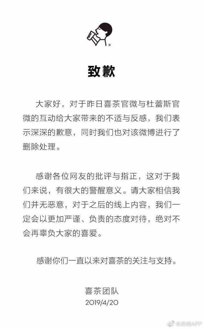 争议声太多,杜蕾斯很快重发了喜茶相关的微博,将“你的第一口最珍贵”改成了“你是我爱喝的奶nice盖guy”,海报上的“今夜一滴也不许剩”也被替换了。
