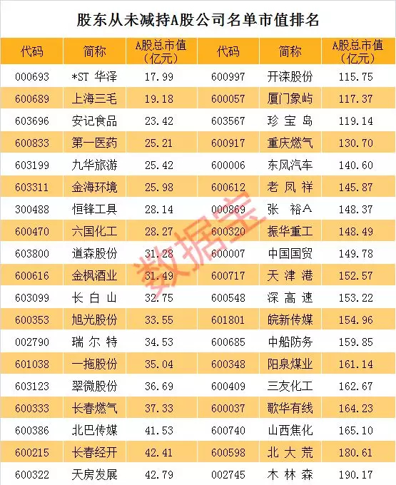 于是,数据宝统计了这样一份名单,股东从未减持公司股份,名单只有109家,可谓极度稀缺。