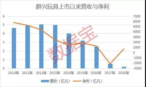群兴玩具2011年在深交所上市,是一家集专业设计、研发、生产、销售各类电子塑胶玩具企业。上市以来,公司业绩一直处于下滑中,上市前一年成了公司业绩最高点的一年,当年净利5761万。而在2011年上市后,当年业绩即出现下滑,净利为5237万,之后净利润连续下滑,2017年甚至出现了亏损。