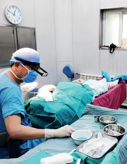 蒋文杰在给患者种植毛囊。摄影/本刊记者 杜玮