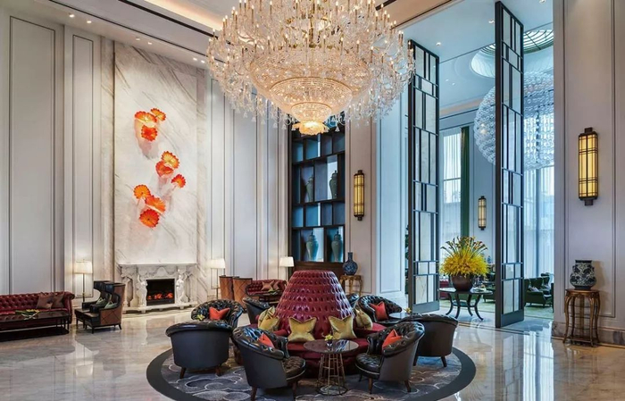 恢弘的酒店大堂层层递进,有对传统中式大宅场景的演绎、也不失对老上海花园洋房的敬意,深藏大堂尽头的圆月造型吊灯与传统枝形吊灯相映成趣,端庄又不失调皮。