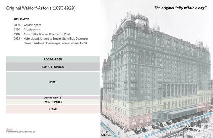 阿斯特四世在给自己和母亲在第五大道840-842号盖大宅的同时还做了另一件事儿,紧挨着华尔道夫酒店盖起了阿斯多利亚饭店,与堂兄的华尔道夫酒店合并后也就构成了后来如雷贯耳的Waldorf=Astoria,串联两者的走廊就是如今盛名的孔雀径。此华尔道夫的最终命运是——于1929年推倒,为帝国大厦的崛起腾出位置。