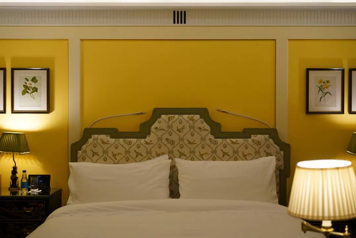 比如在客房中,除了傅厚民招牌的印象画布式地毯和“宫灯“,还引入了致敬阿斯特四式的床头和扶手椅,床背板其实影射了香港街头商铺的卷帘门。镀金年代的优雅风范和香港本地的市井气息交融得迷人又流畅。