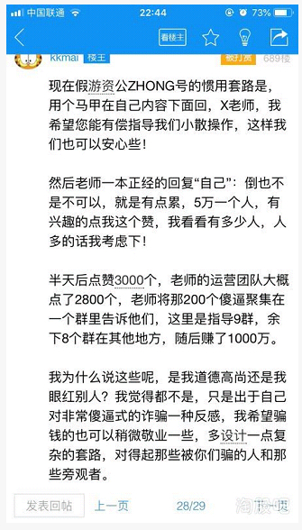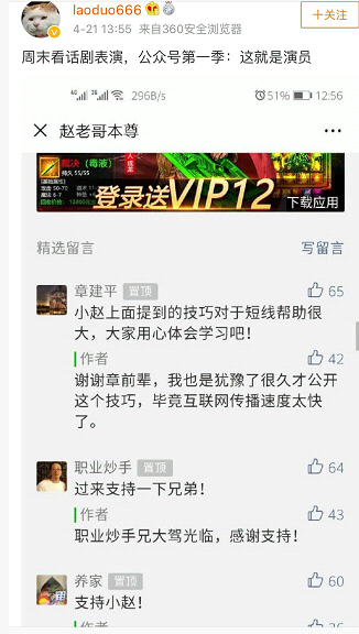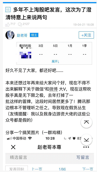 而真正的赵老哥今天在某论坛上亲自辟谣:现在不得不出来解释下关于微信*和微博大V,现在这帮吹股手真是无下限之极,去年打掉了一批这样的冒牌,这段时间居然更多了!腾讯那边根本不管理听之任之,导致现在假货丛生(友情提醒:我以及我身边游资大佬的这些公众号都是假的)分享一个搞笑图片(一群戏精)