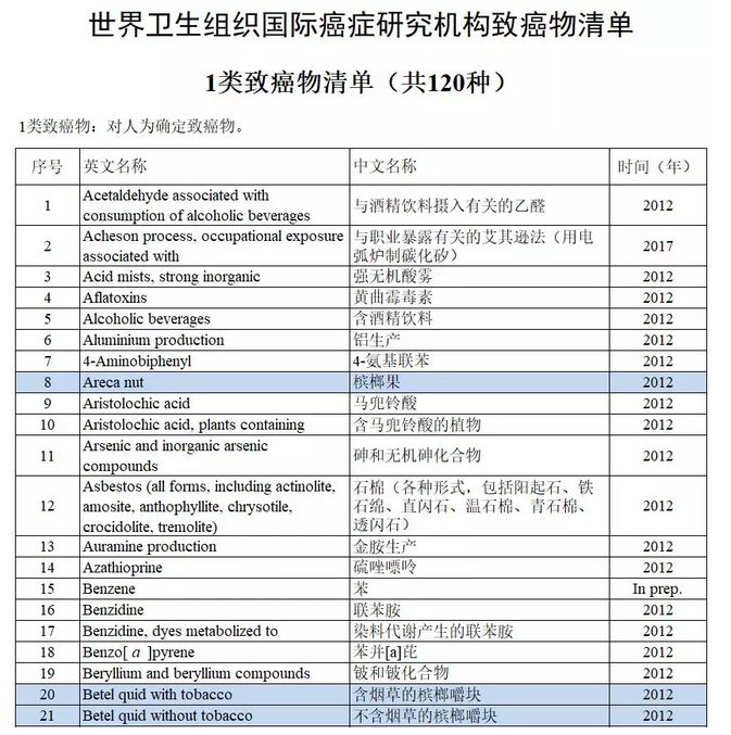 而槟榔第一次被权威机构定义为“致癌物”是2003年。该年世界卫生组织召集印度、马来西亚等有嚼槟榔习俗的东南亚地区国家的口腔医学专家,召开研讨会,中国的台湾地区也派专家出席,最终形成一份报告,认定槟榔为“一级致癌物”。此后,2009年10月,来自10个国家的30位科学家重新评估了包括槟榔在内的药物致癌性,再一次确认,有足够的证据表明槟榔可导致癌症。2012年,世界卫生组织再次确认,并把槟榔列为与砒霜一类的一级致癌物“黑名单”。