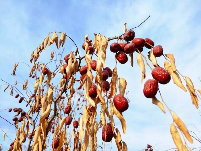 成熟后并不急着采摘,等待其在树梢上自然风干。它属于中国独一无二的“吊干枣”。