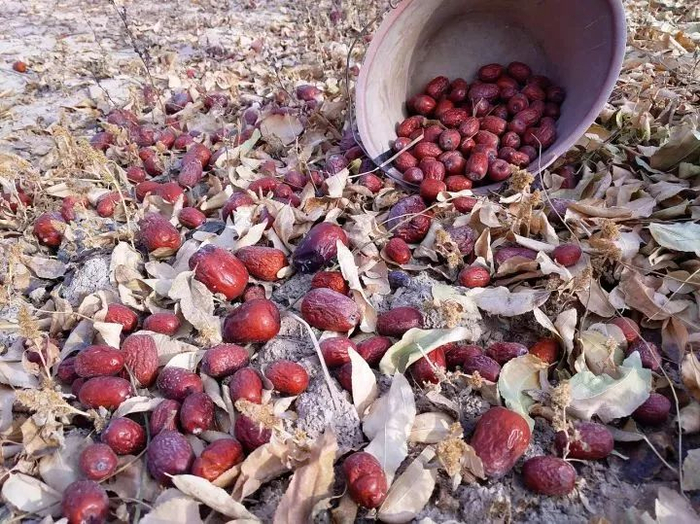 收获时,只要轻轻摇晃果树,枣子就像落叶一般簌簌落地。刚刚采收的灰枣,纯净天然,表皮还带着戈壁滩的风沙。