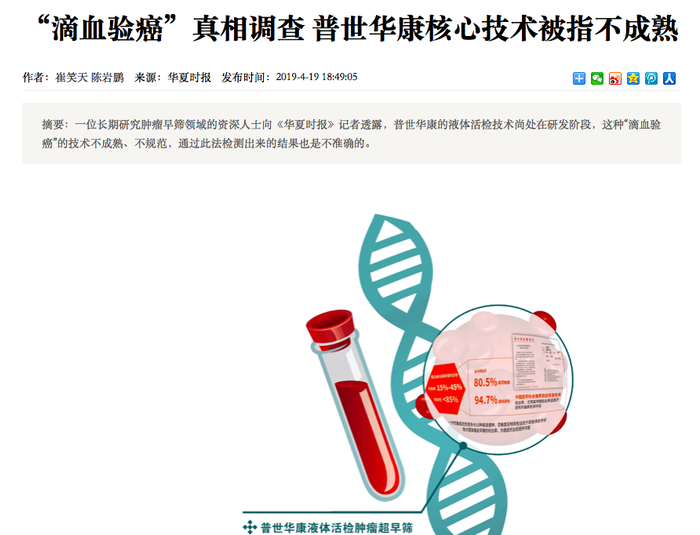 据普世华康母公司为真集团发表的《为真集团普世华康&爱康国宾 携手助力“无癌中国”》一文中显示,爱康自2017年7月起,开始在全国各门店提供普世华康的液体活检服务,包括中国人群高发的18种肿瘤超早期筛查,针对肺癌的专项超早期筛查等。截至目前,该产品已上市近两年。