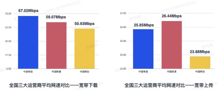 报告中显示,固网宽带上平均下载网速排名第一的是中国电信,为67.02Mbps(8.38 MB/s);排名第二的是中国联通,为59.07Mbps(7.38 MB/s)。平均上传网速排名第一的是中国联通,达到了26.44Mbps(3.31 MB/s);排名第二的是中国电信,为25.85Mbps(3.23 MB/s)。