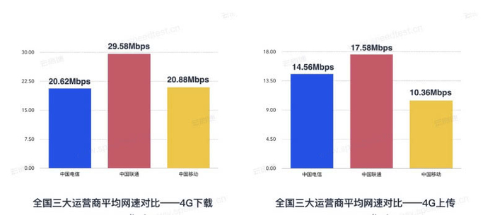 对于4G移动数据网络来说,平均下载网速和平均上传网速最高的都是中国联通,分别达到29.58Mbps(3.7 MB/s)和17.58Mbps(2.2 MB/s)。平均下载网速排名第二的是中国移动,为20.88Mbps(2.61 MB/s);排名第三的是中国电信,为20.62Mbps(2.58 MB/s)。平均上传网速排名第二的是中国电信,为14.56Mbps(1.82 MB/s);排名第三的是中国移动,为10.36Mbps(1.3 MB/s)。