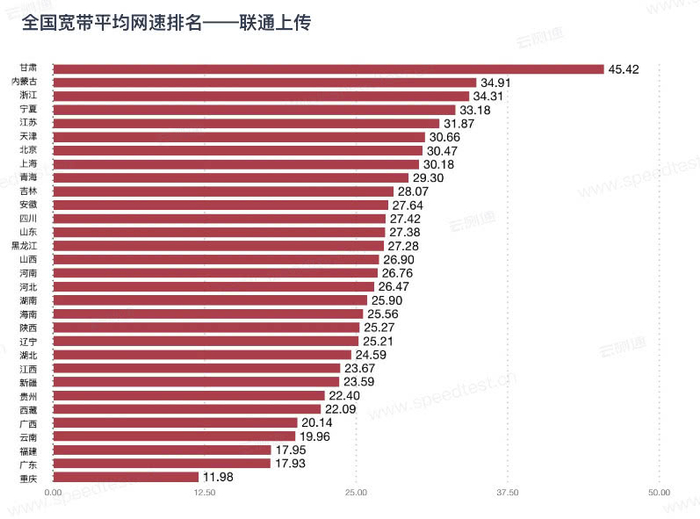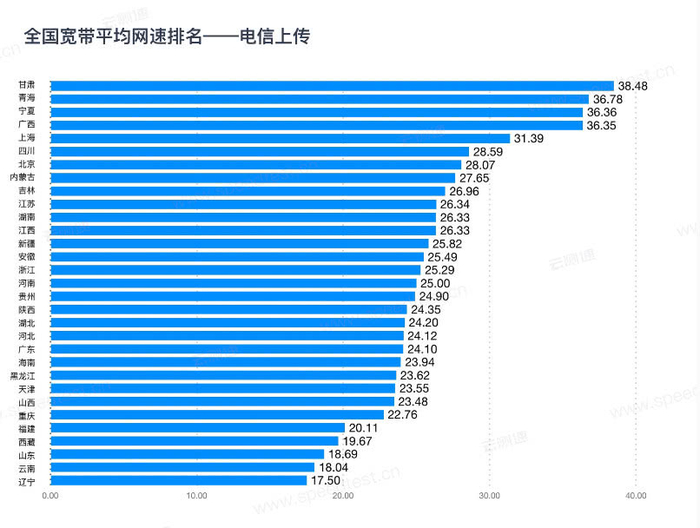 具体到区域的实测宽带网速上,中国电信方面,下载网速最快的是青海、宁夏和甘肃,对应网速分别是91.34Mbps(11.4 MB/s)、89.98Mbps(11.2 MB/s)和87.41Mbp(10.9 MB/s),上传网速最快的是甘肃、青海和宁夏,对应的网速分别是38.48Mbps(4.81 MB/s)、36.78Mbp(4.6 MB/s)和36.36Mbps(4.55 MB/s)。